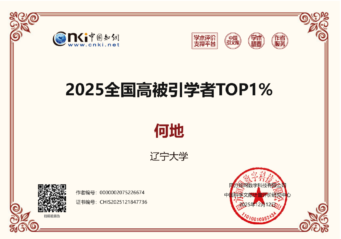 近日,中国知网中国科学文献计量评价研究中心发布了“2025全国高被引学者”名单,何地副教授入选“2025全国高被引学者TOP1%”名单。