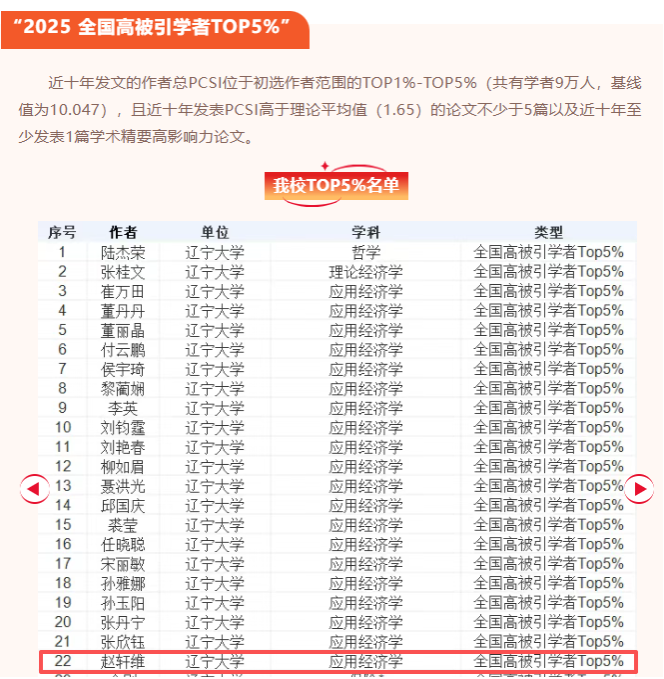 近日,中国知网中国科学文献计量评价研究中心发布了“2025全国高被引学者TOP5%”名单,赵轩维副教授入选应用经济学学者名单。