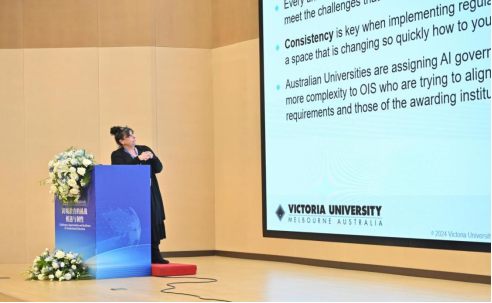 澳大利亚维多利亚大学国际合作办学项目执行教学总监Kathy Michael作题为“The Challenges that Artificial Intelligence Brings to Australian Transnational Programs”的报告,深入剖析了人工智能在全球跨境教育项目快速发展背景下带来的机遇与挑战。